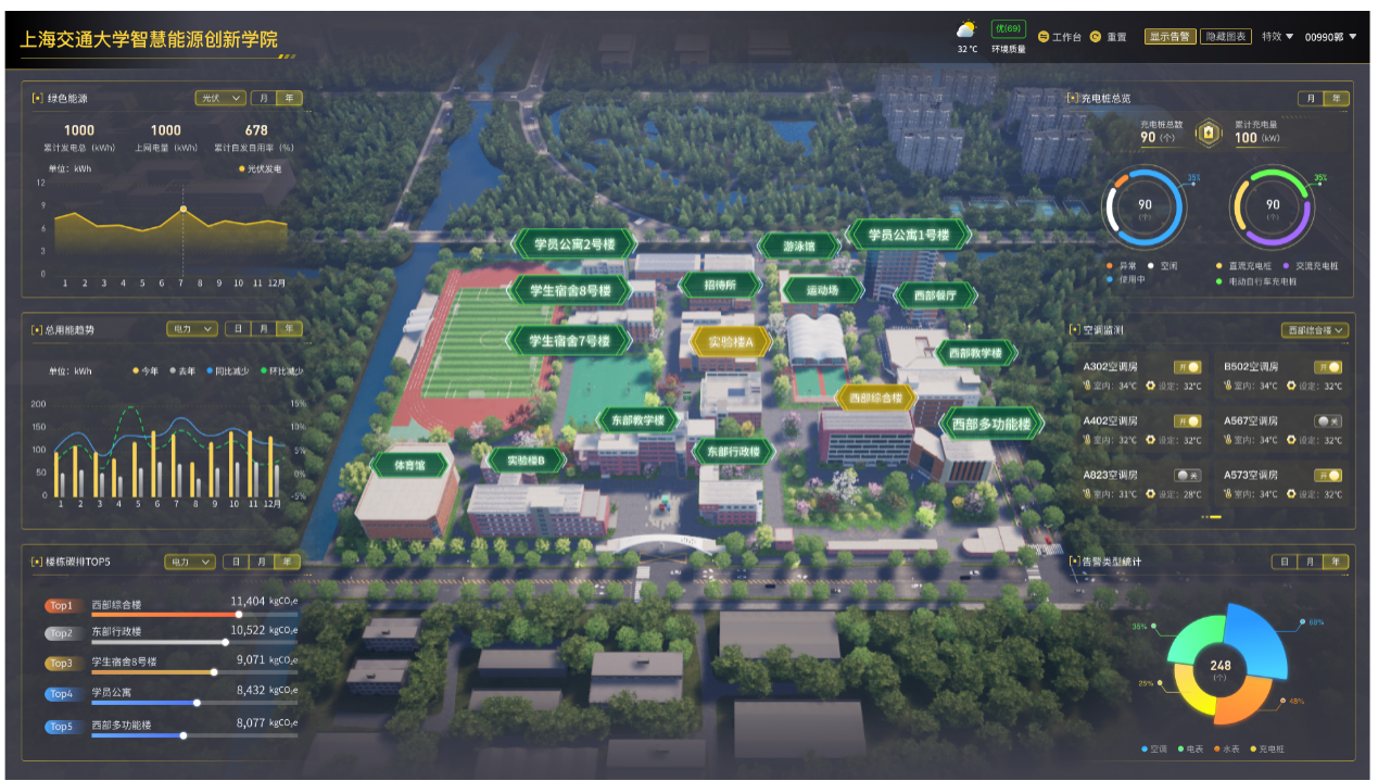 智慧能源数字化平台:在学院装设超过2万个传感器,实现对校园用能系统的精细化监测以及双向调控,并通过打造校园3D模型实现全景可视化。基于该平台,师生可实地测试所开发的AI能源管控算法,同时形成国内国际首屈一指的综合智慧校园能源数据库,为教学、科研、校园宣传提供强力支撑。