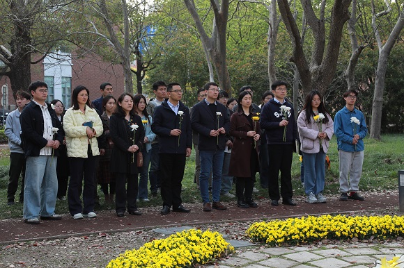 在位于闵行校区叔同路南段淡水河畔的英烈纪念雕塑前,全体党员同志集体缅怀革命先烈。电院博士生微波与天线党支部红色精神宣讲团成员董海棠、韩旭东生动讲述了英烈纪念雕塑落成始末、曾在交大学习或工作的革命先烈事迹,通过回顾那段波澜壮阔的革命岁月,大家深切感受到先烈们坚定的革命理想信念和不屈不挠的革命精神。全体人员在纪念碑前肃立默哀、敬献鲜花,在缅怀英烈的同时,进一步增强了作为中国共产党党员的责任感和使命感。