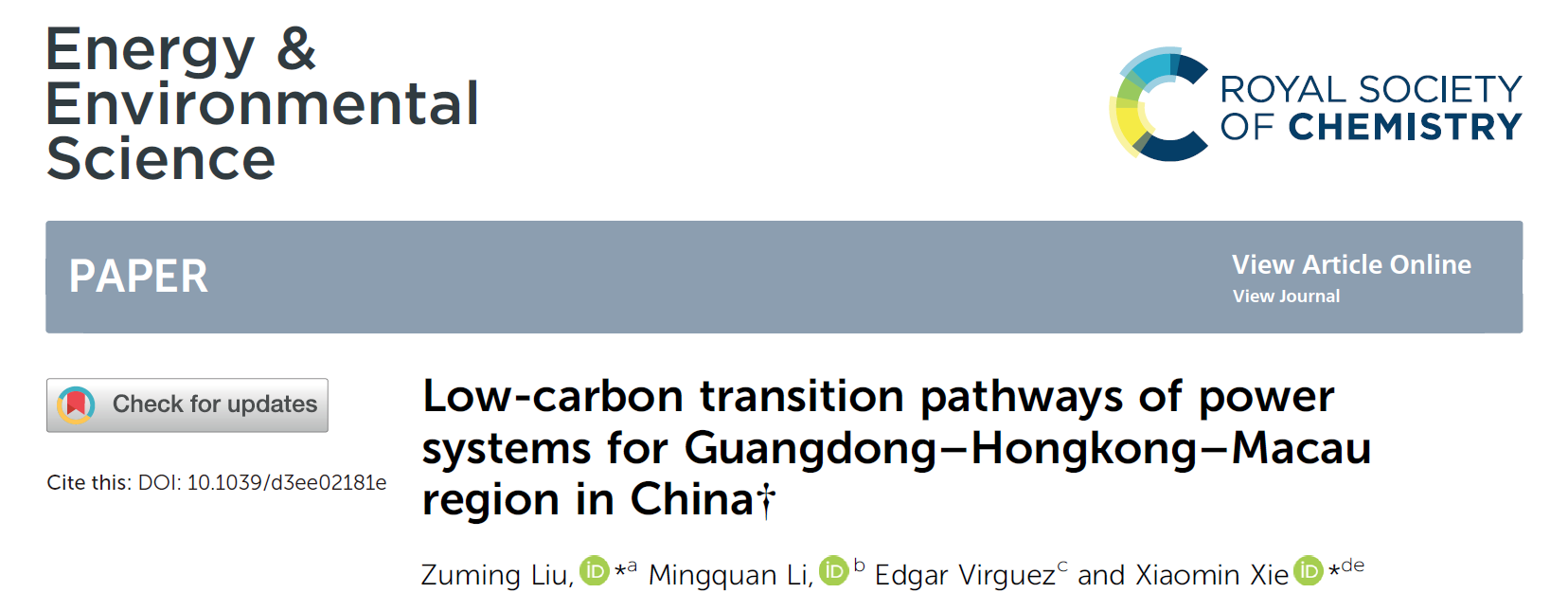 Liu Z, Li M, Virguez E, Xie X. Low-carbon transition pathways of power systems for Guangdong-Hongkong-Macau region in China. Energy & Environmental Science 2023; doi: 10.1039/d3ee02181e.