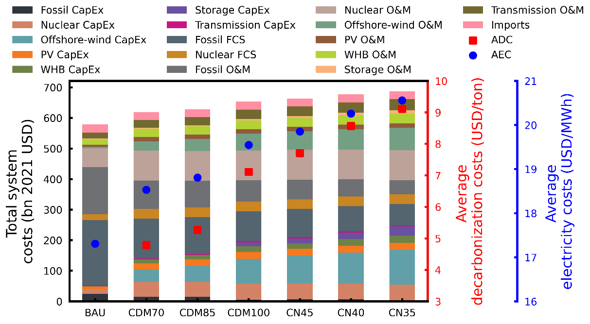 图3粤港澳地区电力系统不同场景的转型费用、平均脱碳成本、和电力成本。