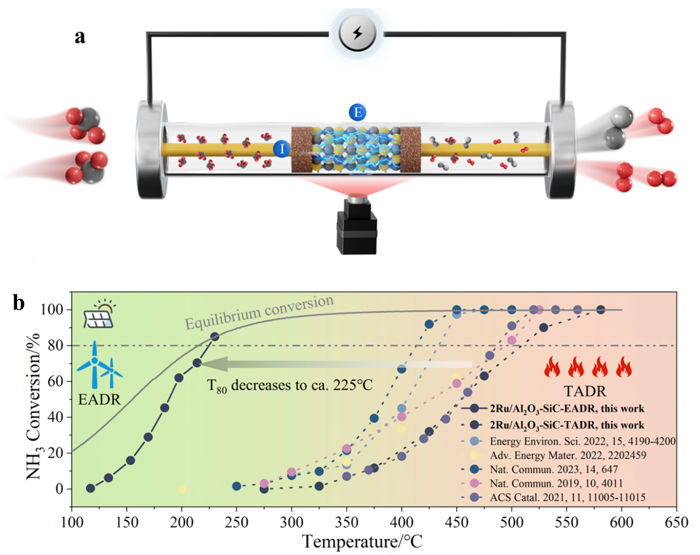 零碳氢基能源(NH3、H2)在汽车、船舶、可再生电力储存及工业应用中展现出巨大的应用前景。然而,绿氢的存储运输困难且成本高,氨具有较高的含氢量(17.8 wt%)以及易于液化的优势,是一种理想的储氢载体,利用氨分解制氢技术实现站内(on-site)制氢,可解决氢气运输和储存难题。在交通运输领域,氨燃料发动机是实现燃料脱碳的重要技术路线,通过氨分解制氢实现氨氢融合燃烧,可解决单一氨燃料的点火和燃烧问题,是氨燃料发动机的关键技术。因此,氨分解制氢技术是零碳氢基能源利用的关键环节。氨分解反应(2NH3(g)N2(g)+3H2(g))在300℃、1bar条件下,理论平衡转化率可超过95%。但由于反应存在较大的动力学阻力,传统的热催化氨分解过程通常需要400℃以上的高温才能实现80%以上的氨分解转化率。因此,当前迫切需要开发温和条件下高效、低能耗的氨分解制氢新技术。