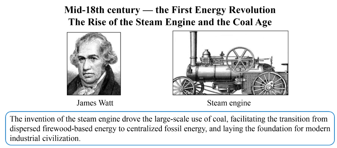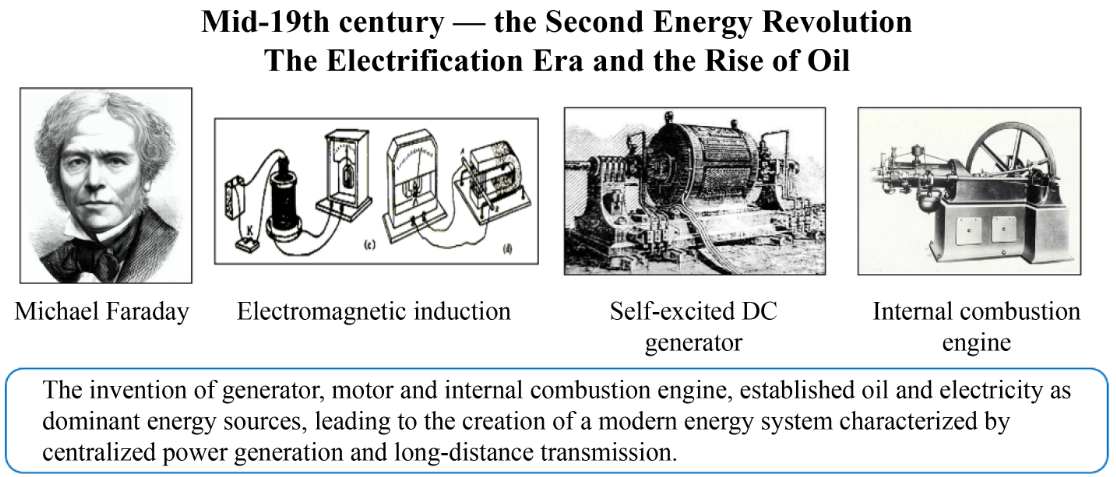 理解当下正在发生的能源革命,需要我们从人类能源演进的历史维度进行审视,第一次能源革命,始于18 世纪中叶,瓦特发明蒸汽机,实现了用机器代替手工工具劳动,推动了煤炭的大规模利用,实现了从分散的薪柴能源向相对集中的化石能源利用的转变,开启了现代工业文明。第二次能源革命,始于 19 世纪中叶,法拉第发现电磁感应现象,发电机、电动机等的发明及电力和内燃机技术的突破,使石油和电力成为主导能源,建立了集中发电、远距离输送的现代能源体系,使人类进入到电气化时代。