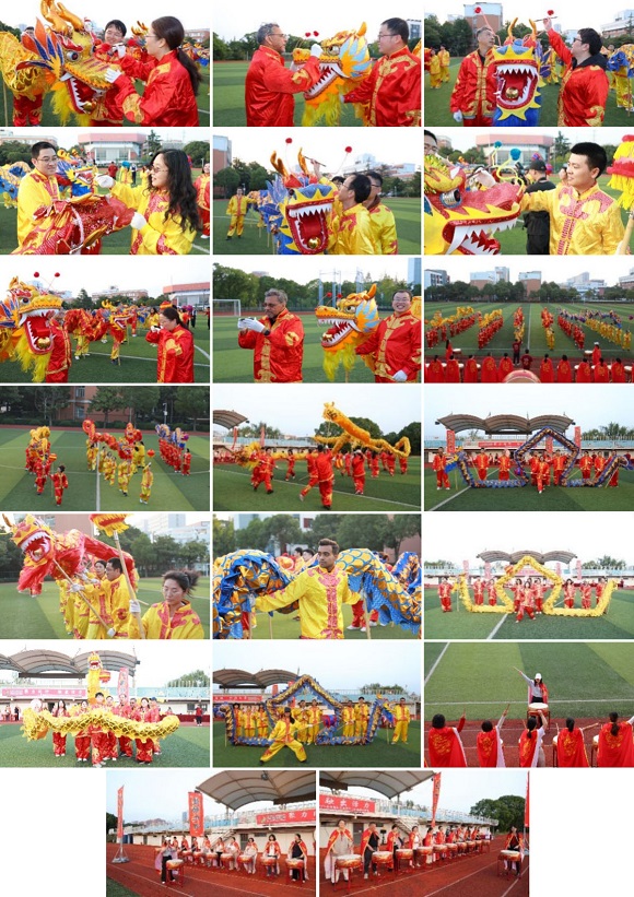 学院教职工灵活分组,顺利产生龙阵和鼓阵两大阵营。6条神龙在专业教练的带领下练习起龙、盘龙、游龙、穿龙、元宝龙、八字舞龙等一系列经典动作。龙珠、龙头、龙身、龙尾,各司其职、紧密合作;翻江倒海、神龙摆尾、勇攀高峰,舞姿灵动、惟妙惟肖。鼓阵全体队员通力合作、配合默契,动作整齐划一、擂鼓声壮,鼓点热烈激昂、振奋人心。