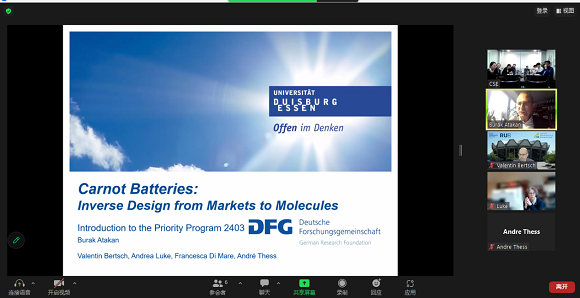 顾骏首先介绍学院产教融合背景以及学院在科研领域取得的成果,院企合作与国际化部文琳介绍学院专业设置和学生情况。德国杜伊斯堡-埃森大学Prof. Dr. Burak Atakan介绍SPP 2403 Priority Programme “Carnot Batteries: Inverse Design from Markets to Molecules”相关研究内容。学院赵耀副教授就卡诺电池相关科研情况进行分享。最后在双方讨论环节,学院和德国两所大学教授就卡诺电池研究前景、市场价值以及学术国际会议和学生spring school 等方面进行了意见交流。