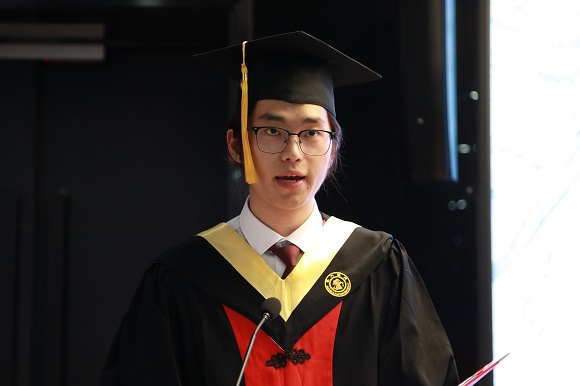 毕业生代表邢宇和梁珈玮发言。核工程与核技术专业的邢宇在发言中感谢了学院和老师们的培养,祝愿各位同学带着不断进步、不断攀登的精神迎接更广阔的世界。
