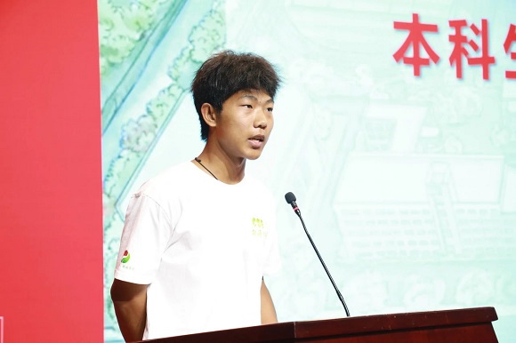 本科生新生代表韩庆鑫发表入学感言。他通过分享自己在筑力学习营与军训特战连的经历,勉励新生们以勤致业精,以思致业成。他认为,我国处于能源绿色转型的关键时期,作为能源学子,要明确时代使命,不断提升自我,为国家可持续发展注入强劲动力,彰显能源青年的无限潜能。